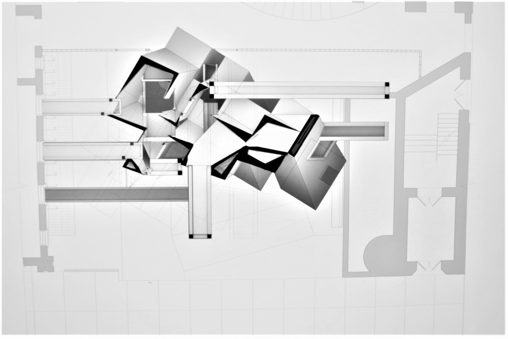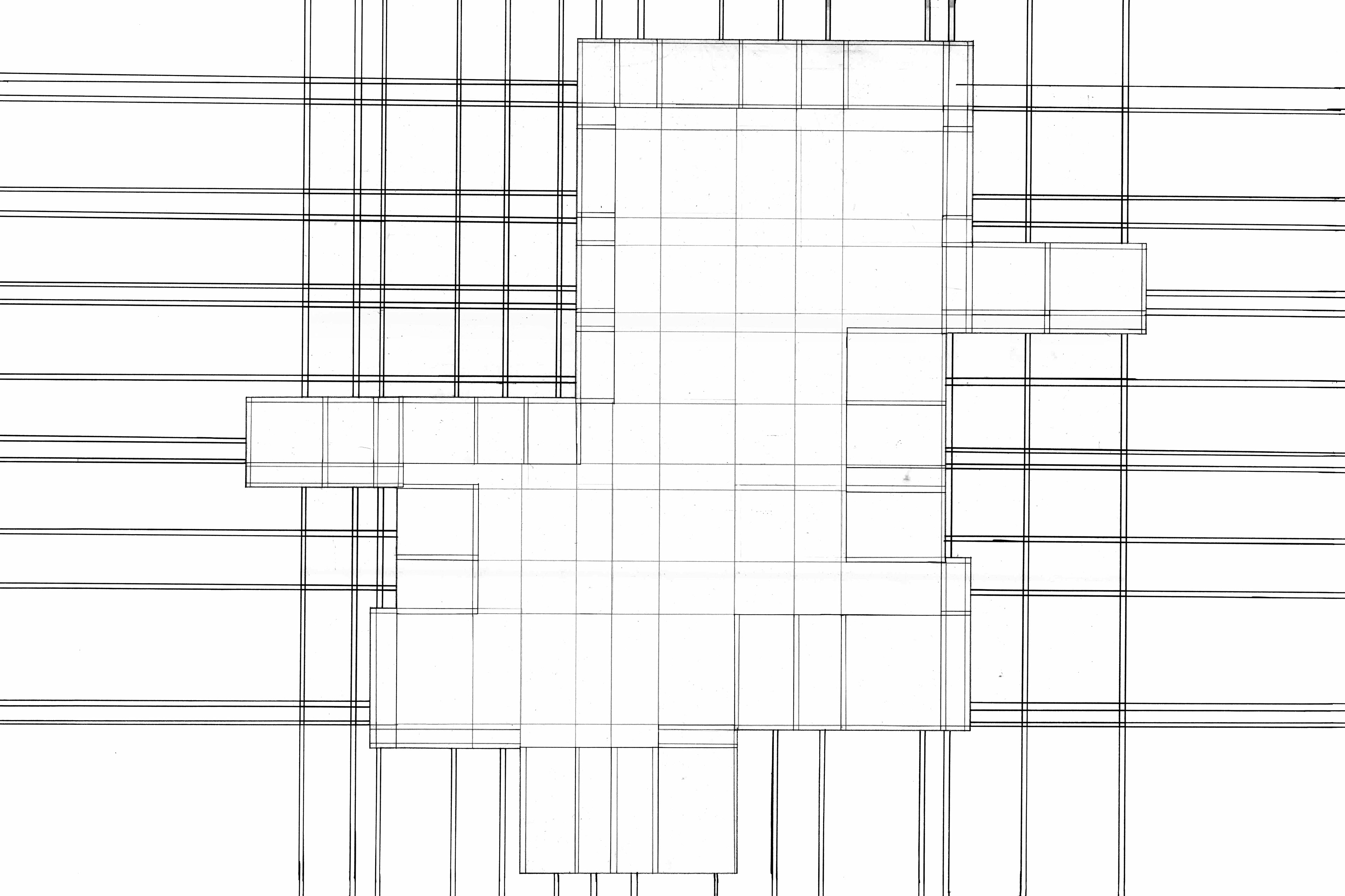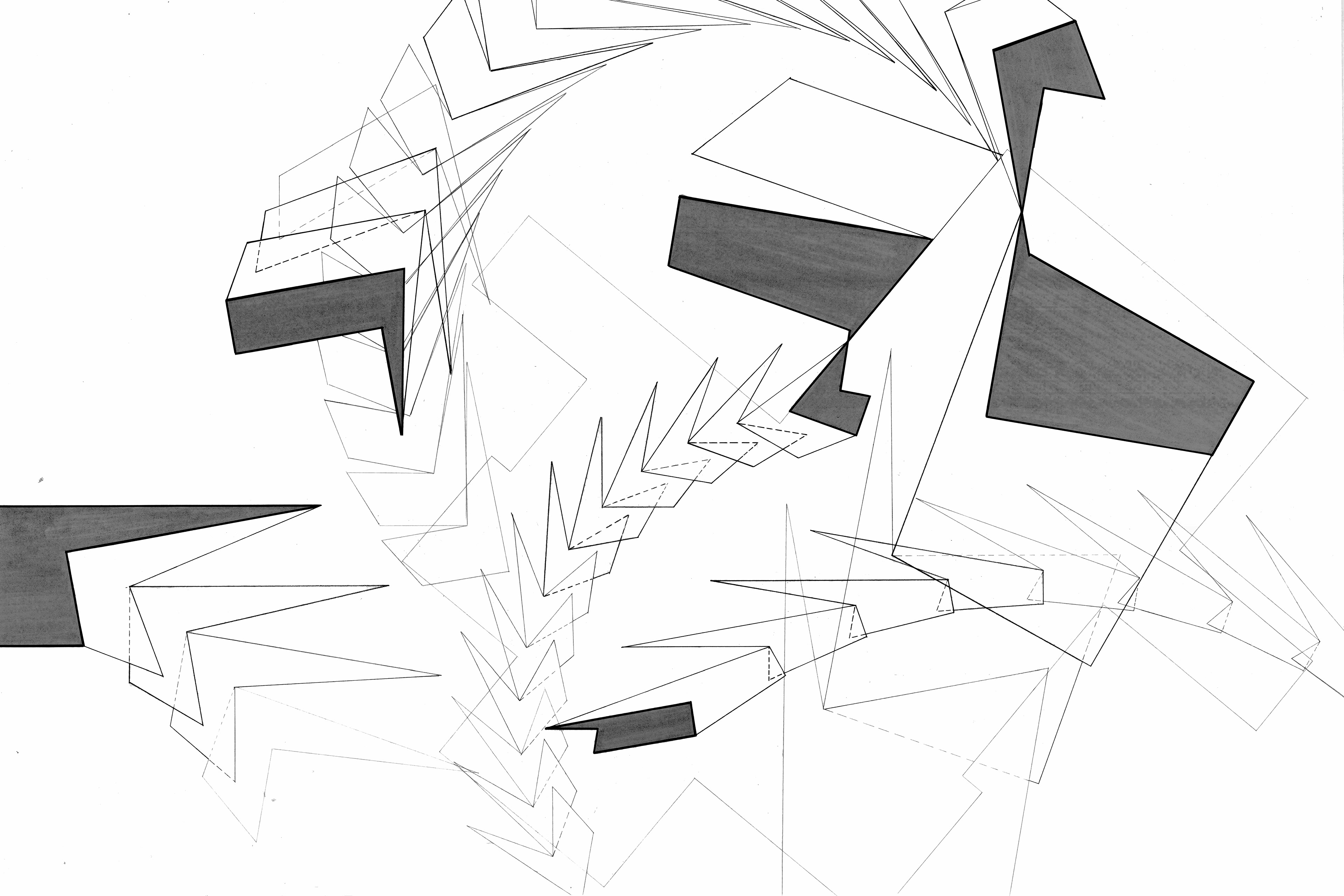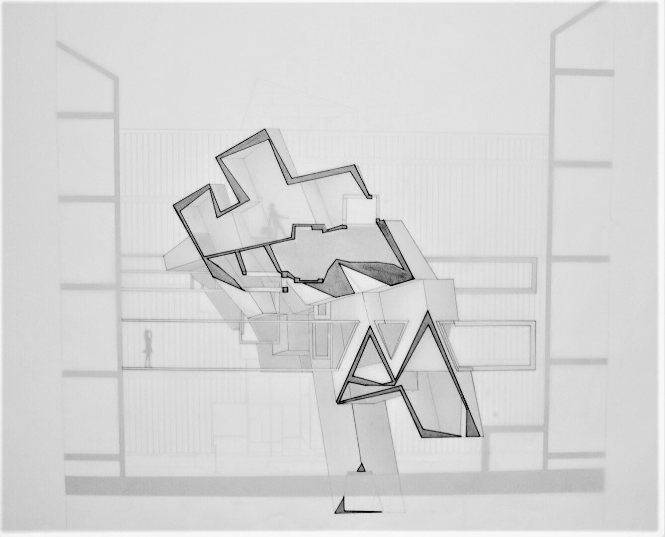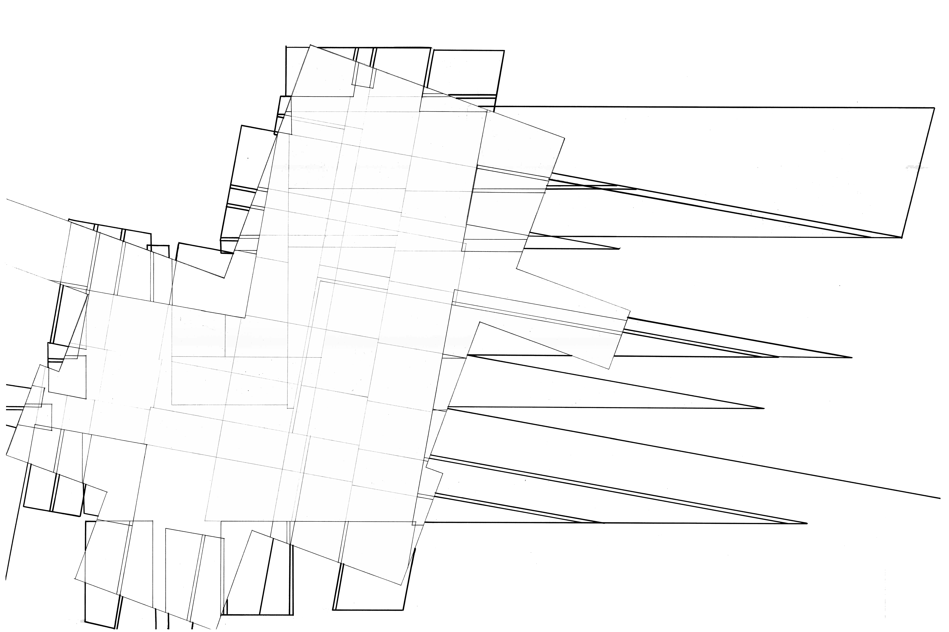 A first-year project where different systems such as body motion, blending shapes, and facade analysis were generated that lead to hybridization to create an architectural proposition in the Higgins Hall Plaza. Using the Steven Holl created facade of Higgins Hall, series of layered drawings were created from which emerged the hand drawing seen on the right. The architectural proposal was a hybrid of two different systems: solid and framed void. In the project, I resolved how two systems can coexist in the same space and defined their relationship where they collided.