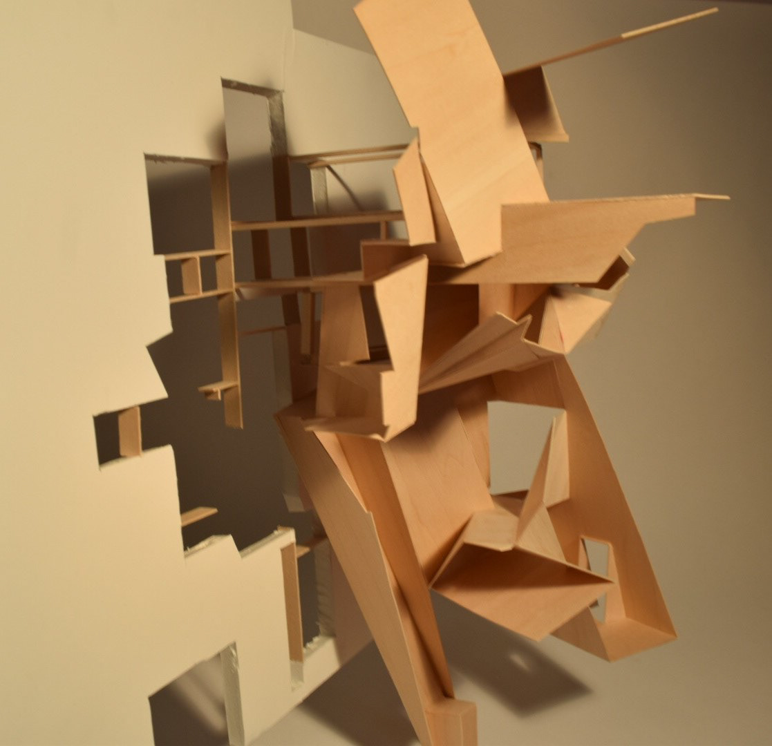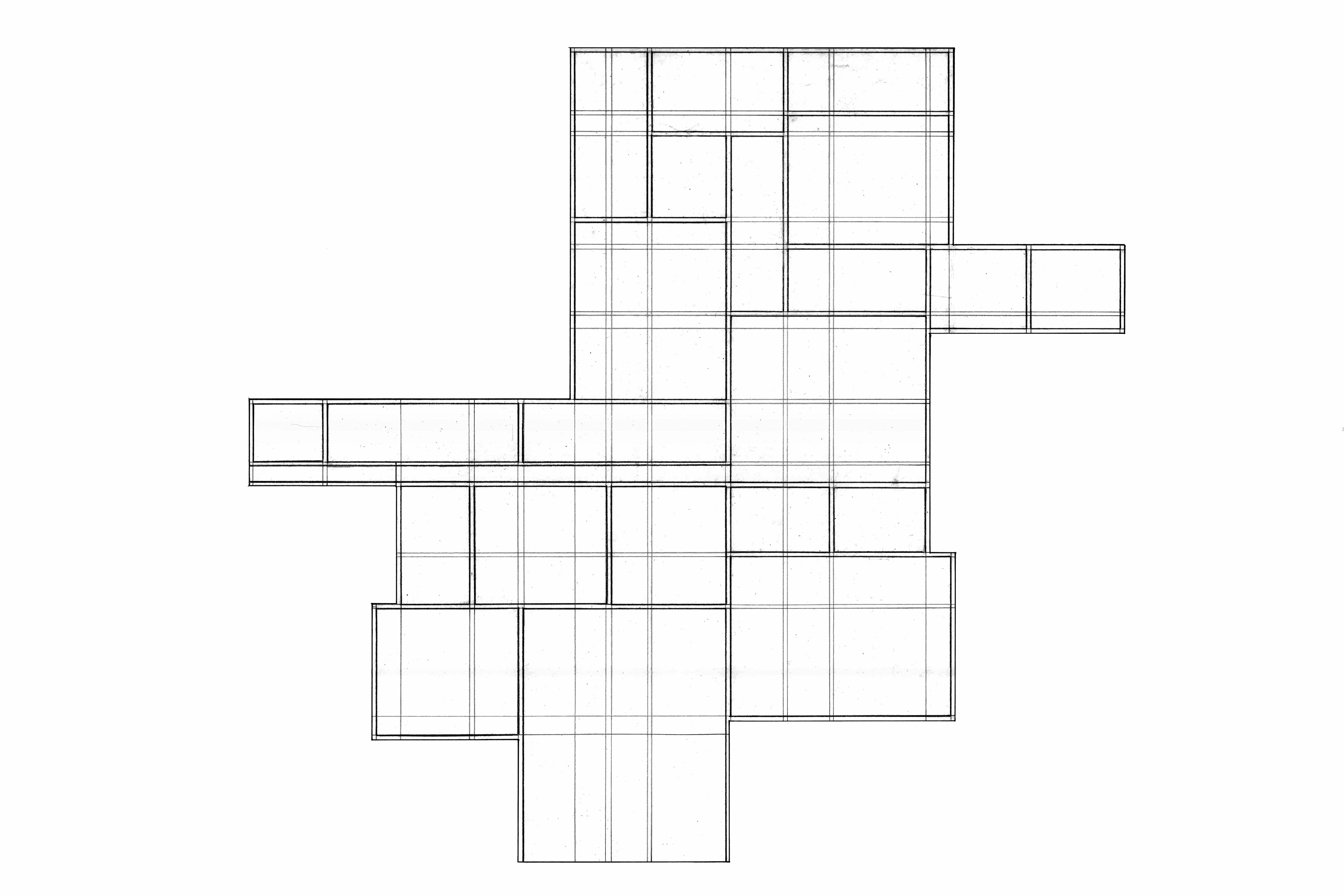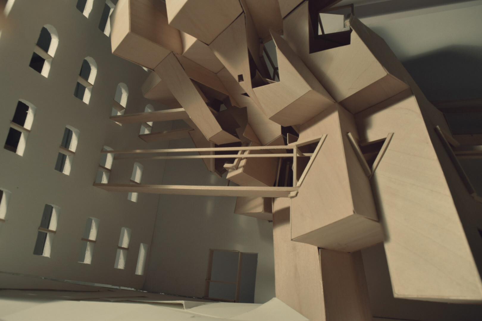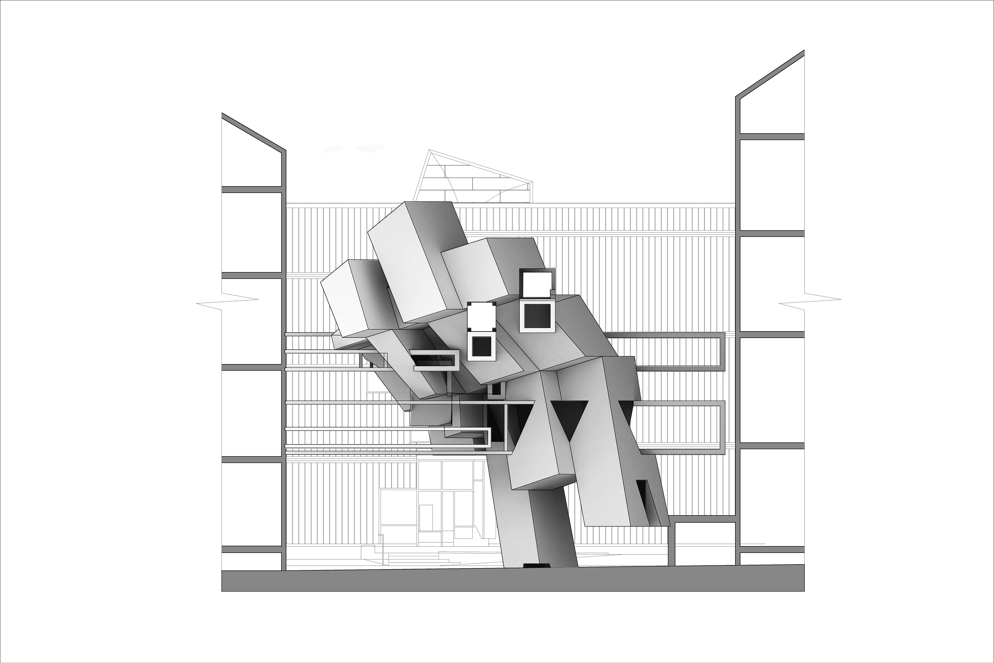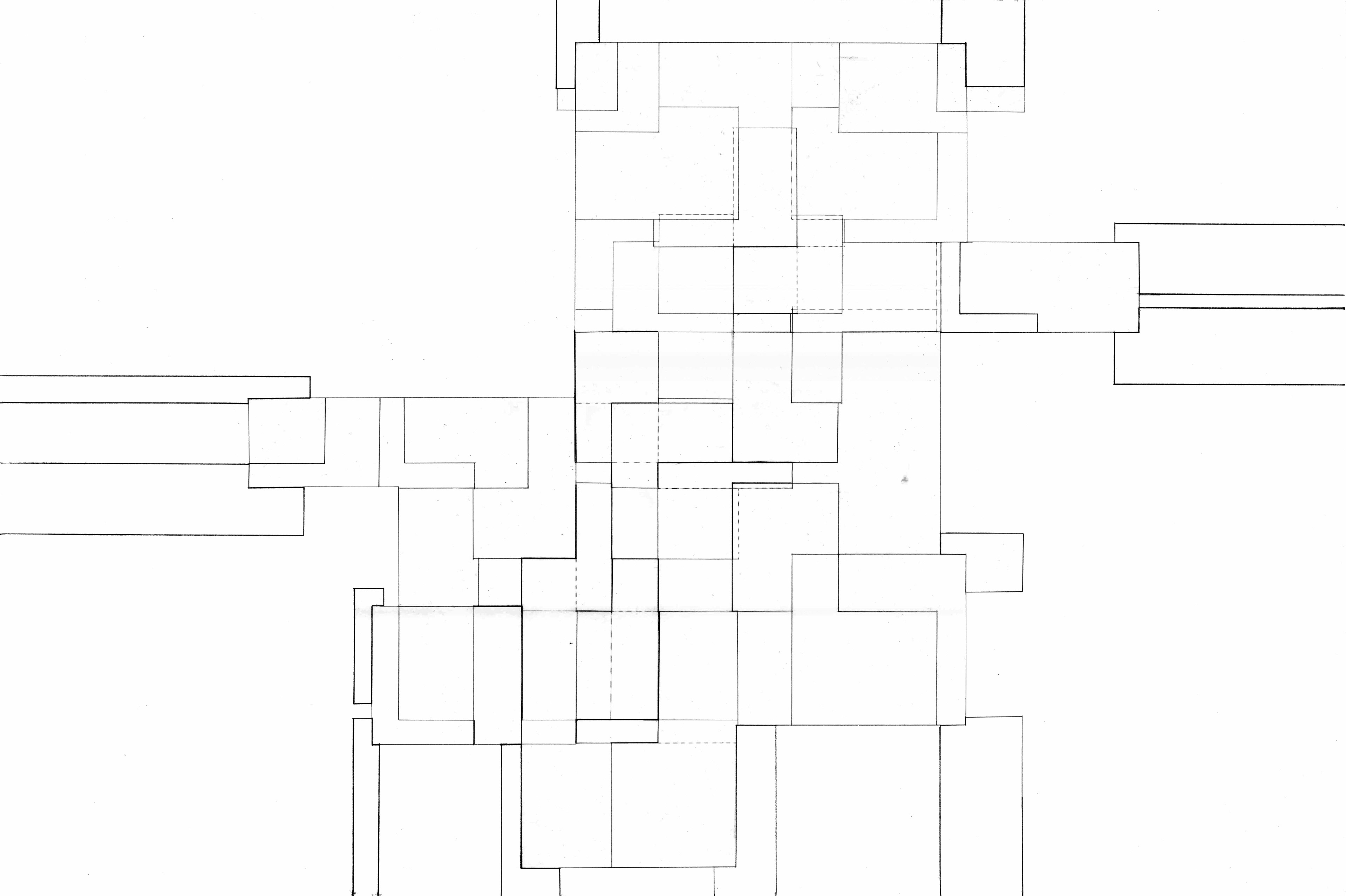 A first-year project where different systems such as body motion, blending shapes, and facade analysis were generated that lead to hybridization to create an architectural proposition in the Higgins Hall Plaza. Using the Steven Holl created facade of Higgins Hall, series of layered drawings were created from which emerged the hand drawing seen on the right. The architectural proposal was a hybrid of two different systems: solid and framed void. In the project, I resolved how two systems can coexist in the same space and defined their relationship where they collided.
