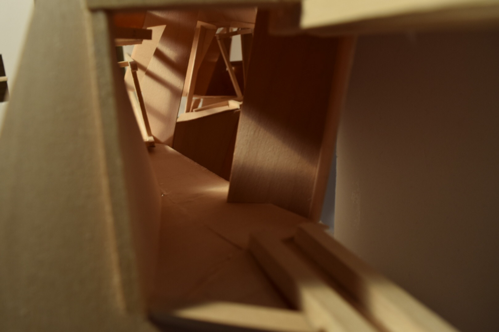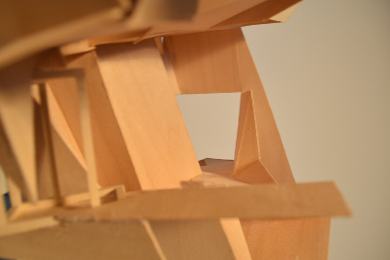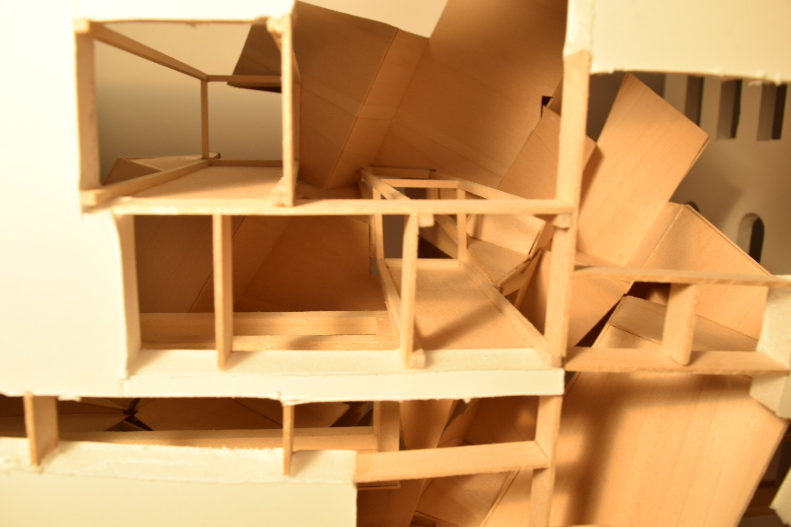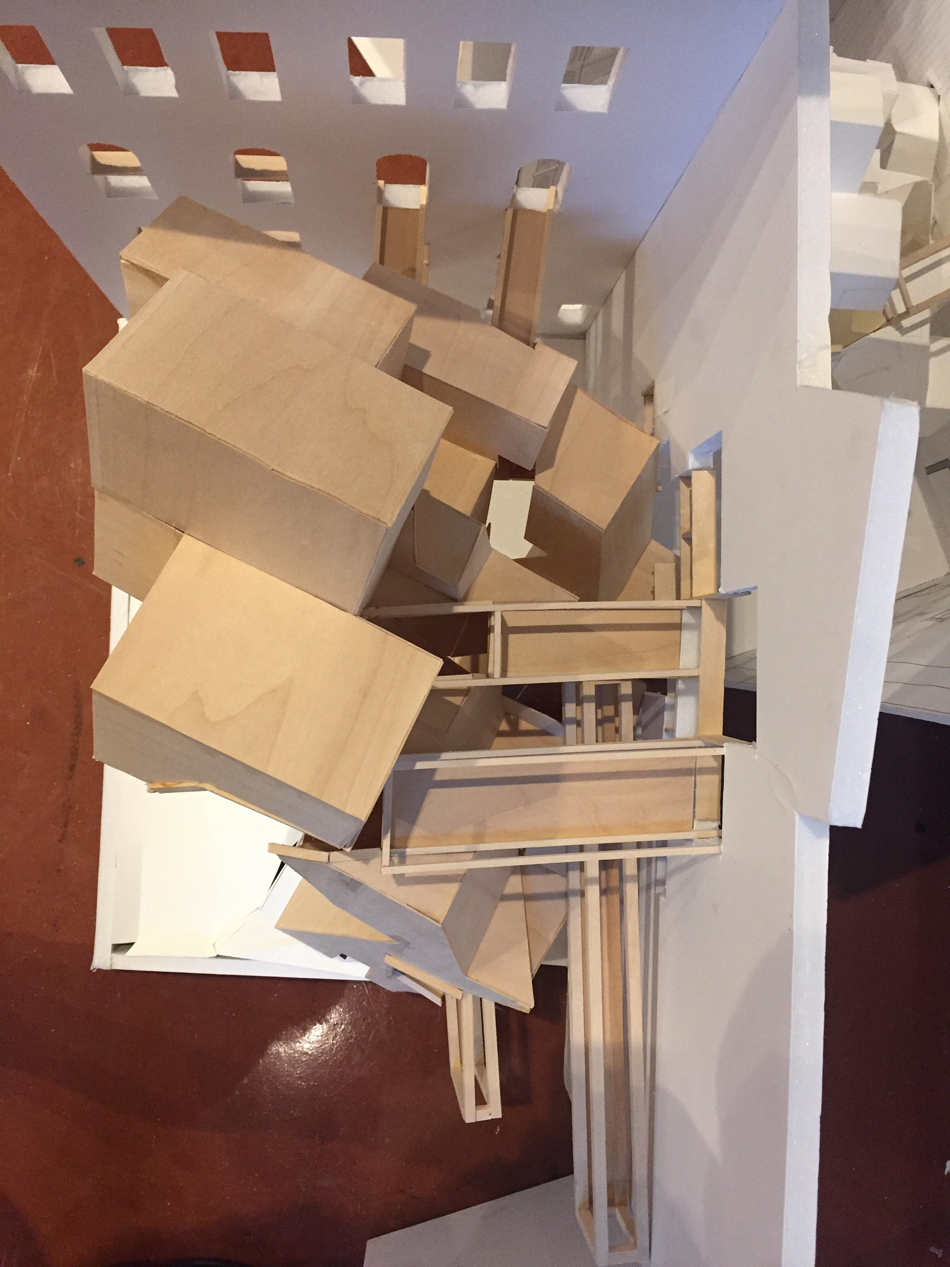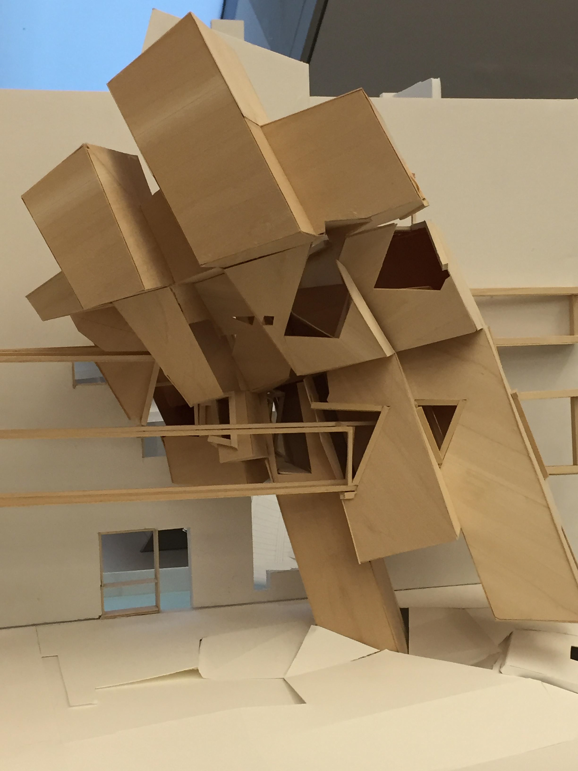 A first-year project where different systems such as body motion, blending shapes, and facade analysis were generated that lead to hybridization to create an architectural proposition in the Higgins Hall Plaza. Using the Steven Holl created facade of Higgins Hall, series of layered drawings were created from which emerged the hand drawing seen on the right. The architectural proposal was a hybrid of two different systems: solid and framed void. In the project, I resolved how two systems can coexist in the same space and defined their relationship where they collided.