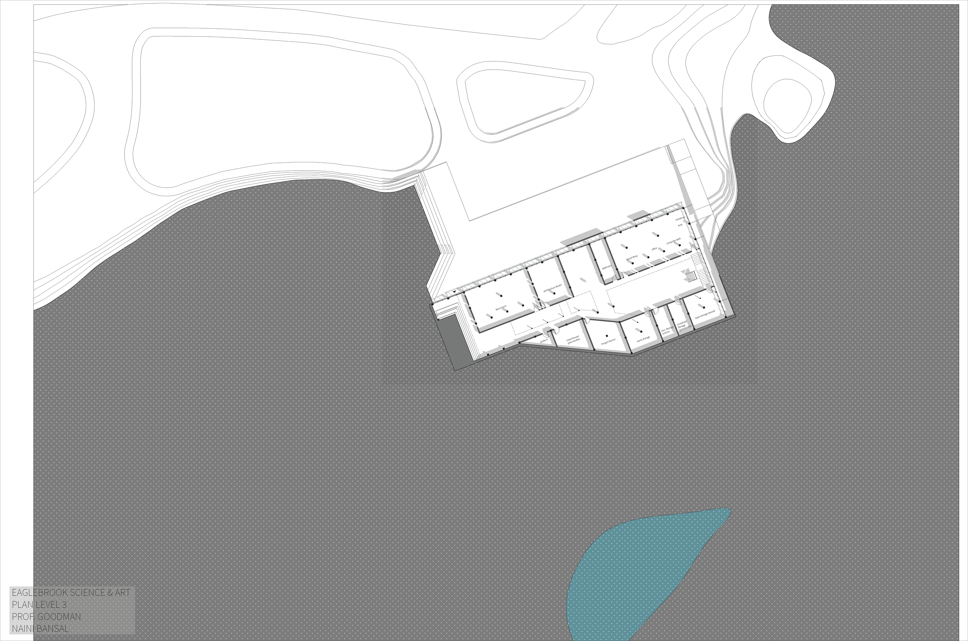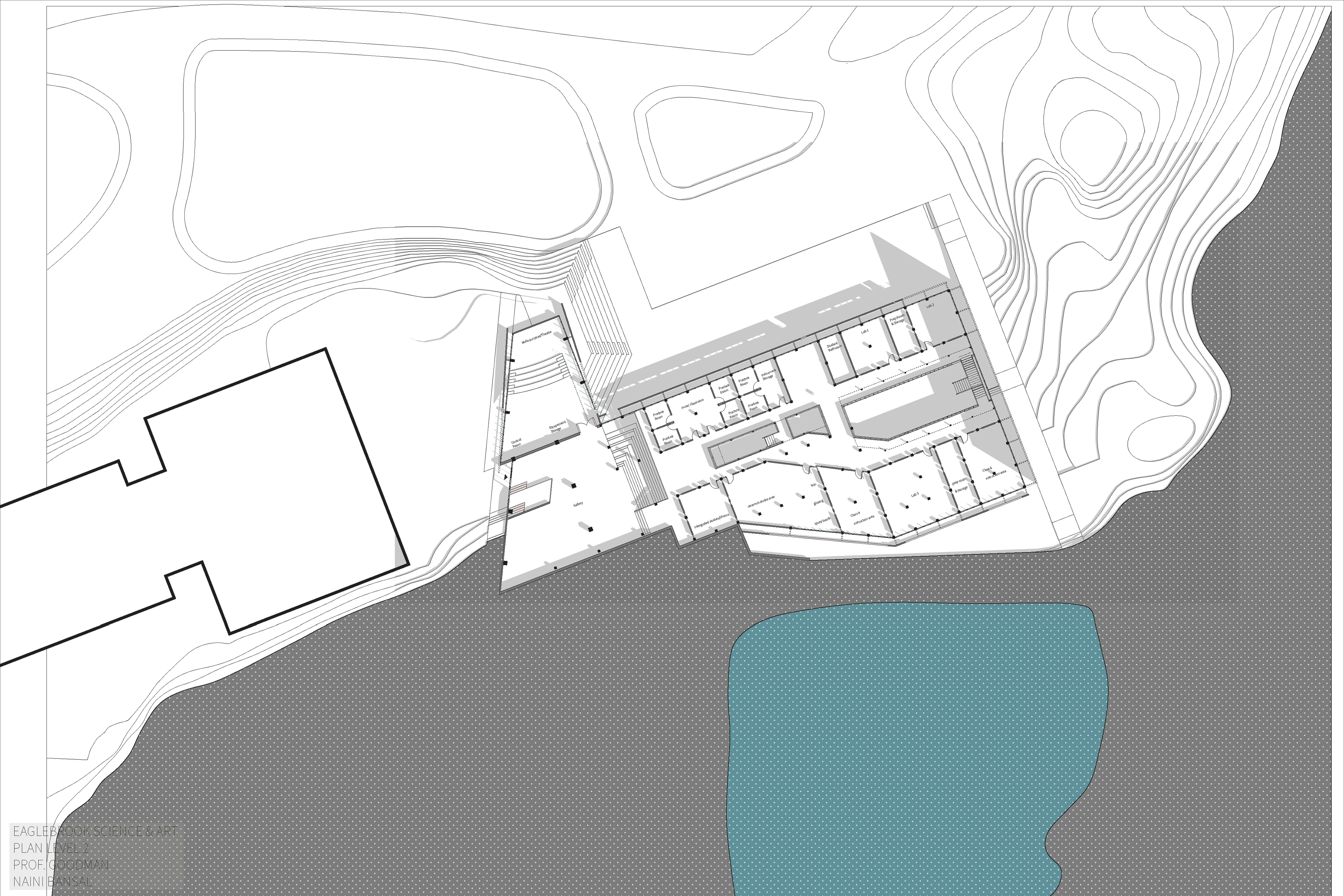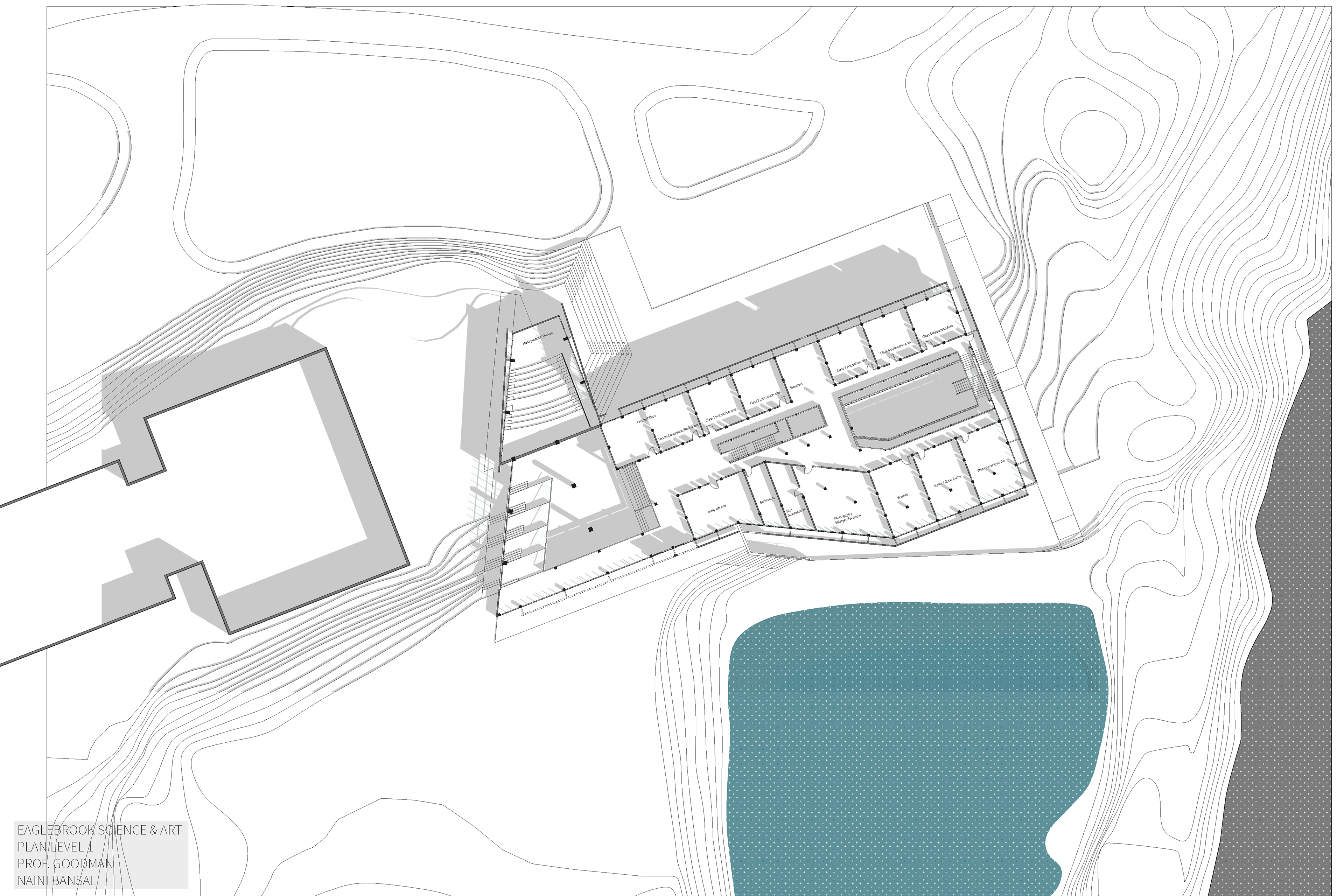 Eaglebrook School in Deerfield, Massachusetts is a boarding and day junior school. The project asks for a new school of arts and sciences on the 800-acre campus. The school wants to integrate the classes and not create a separation between the two different programs. I designed this building based on the users and the site conditions. Circulation is created as a space for interaction between the students and the architecture. Layers of materials are used such as: wood structure and roof, floor to ceiling curtain wall as a tight building envelope and a façade skin. This layering allows for porosity throughout the building. The openings on the façade are based on how the interior spaces are being used. For example, the labs require high stools therefore, the openings are on eye-level of the users.